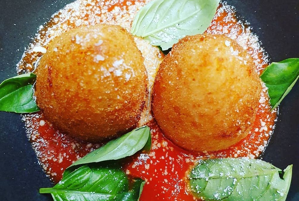 Crumbed, deep fried rice ball filled with a bolognese sauce