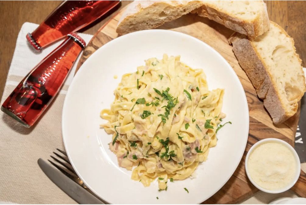 Tossed with bacon, egg, onion & garlic in a creamy white sauce