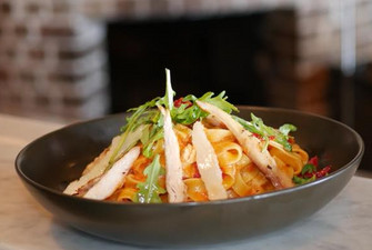 Chicken, pine nuts, sundried tomatoes, tossed in a creamy rosa sauce, topped with rocket & shaved parmesan