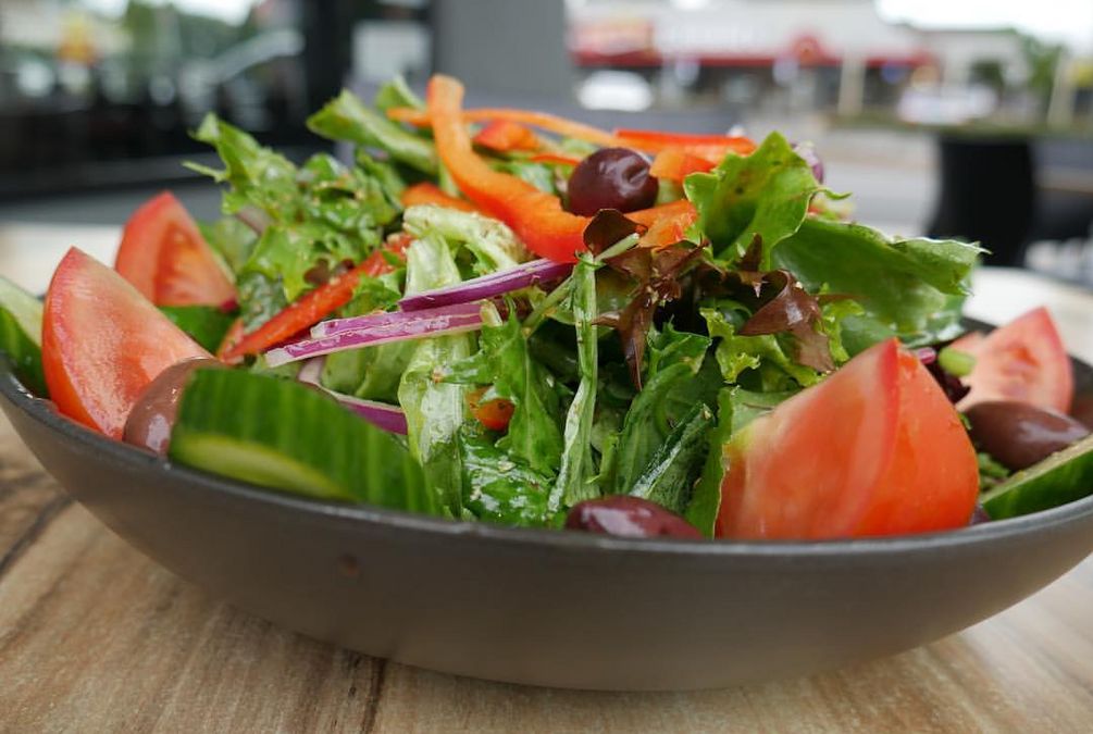Mixed lettuce, cucumber, cherry tomatoes, red onion, red capsicum, olives, feta cheese tossed with a vinaigrette