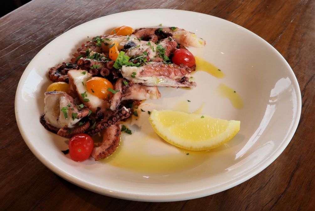 Medium octopus, tossed with garlic and cherry tomato on an olive & roast capsicum tapenade