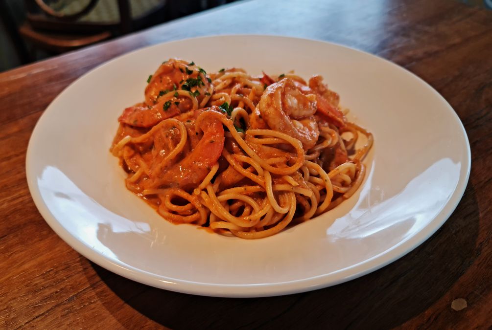 Prawns tossed with pesto in a creamy rosa sauce
